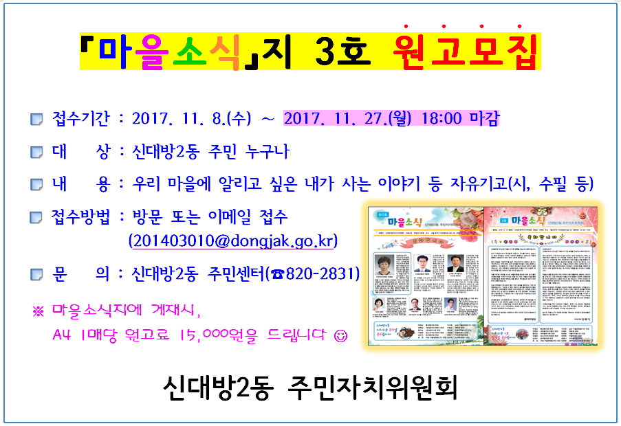 (마을신문에 게재시 A4, 1매당 원고료 15,000원을 드립니다.)