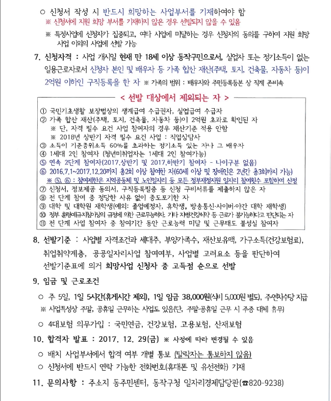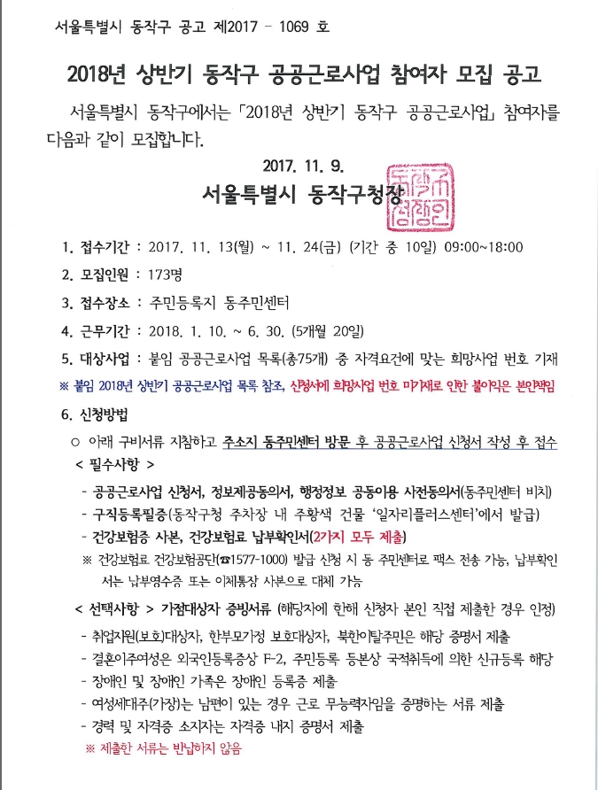 2018년 상반기 동작구 공공근로사업 참여자 모집 공고