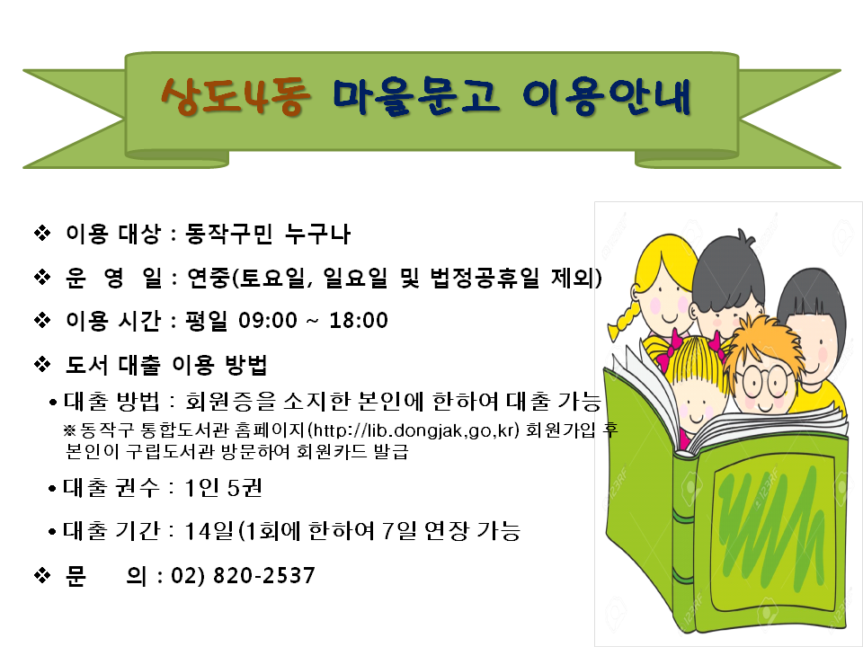 ※ 도서검색 및 회원가입 : 동작구 통합도서관(http://lib.dongjak.go.kr)