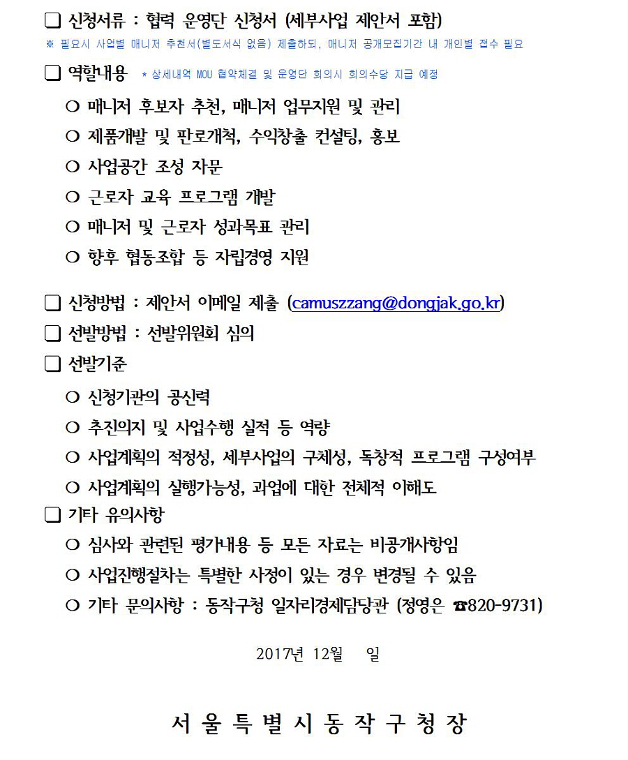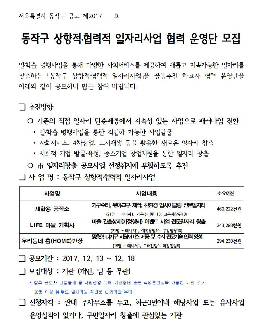 동작구 상향적&협력적 일자리사업 협력 운영단 모집