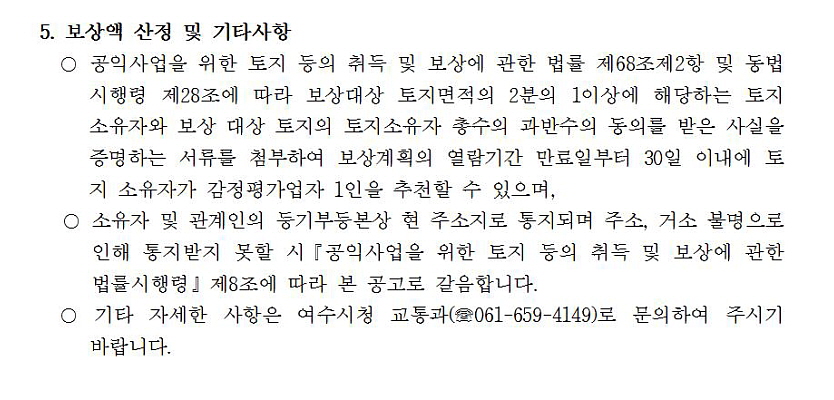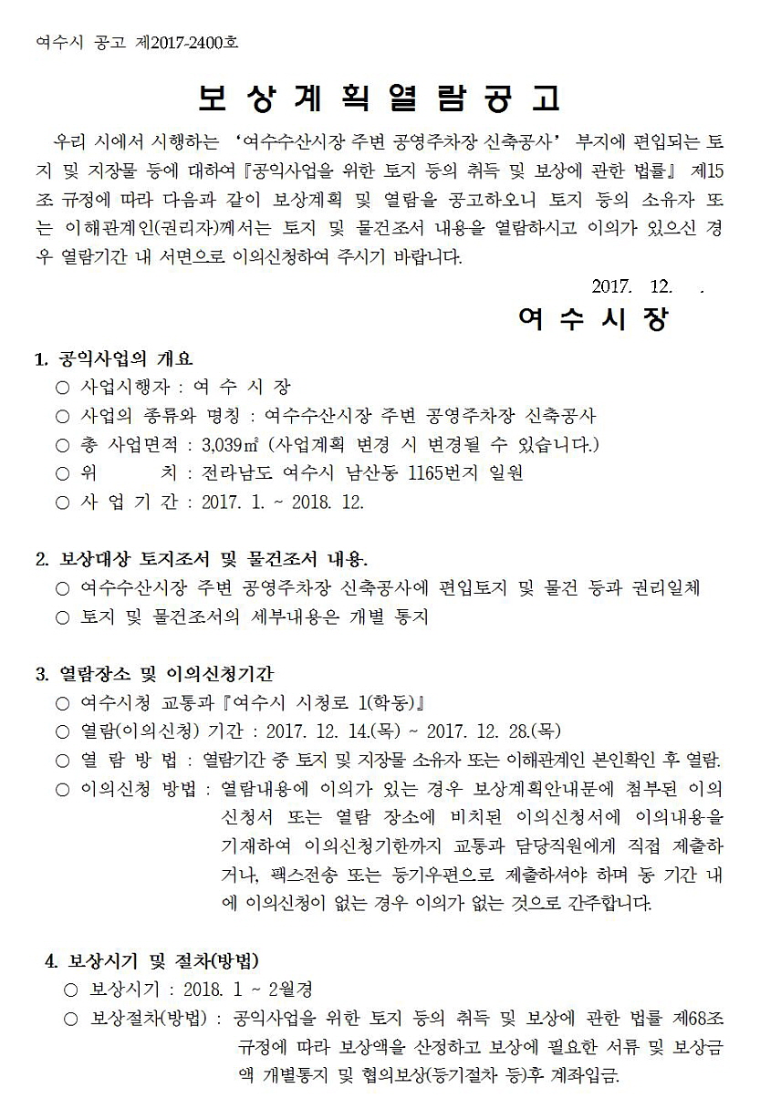 여수수산시장 주변 공영주차장 신축공사 보상 계획 열람 공고
