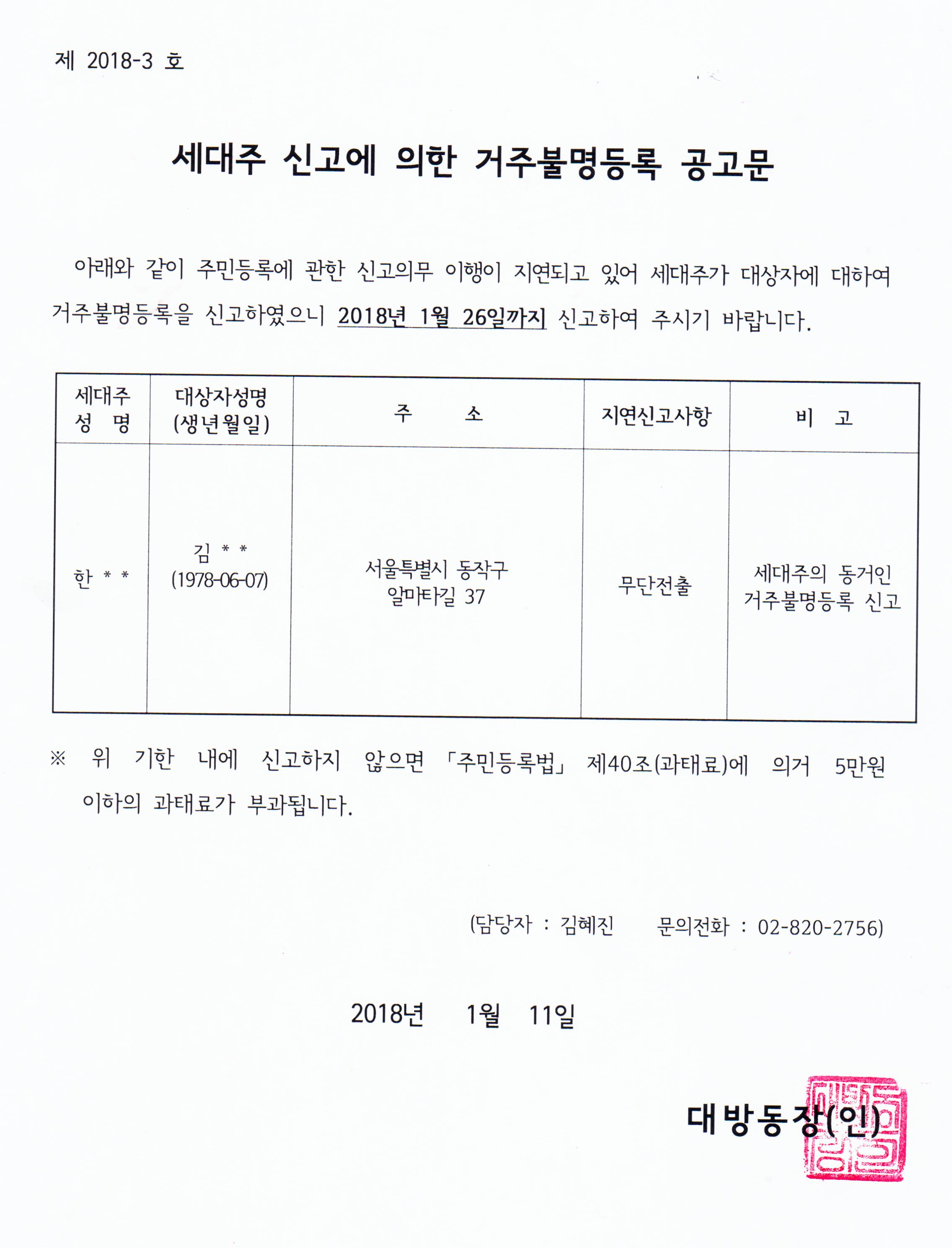 『주민등록법』 제10조(신고사항)의 규정을 위반한 자에 대하여 세대주가 거주불명등록을 신고하여 아래와 같이 공고 합니다.