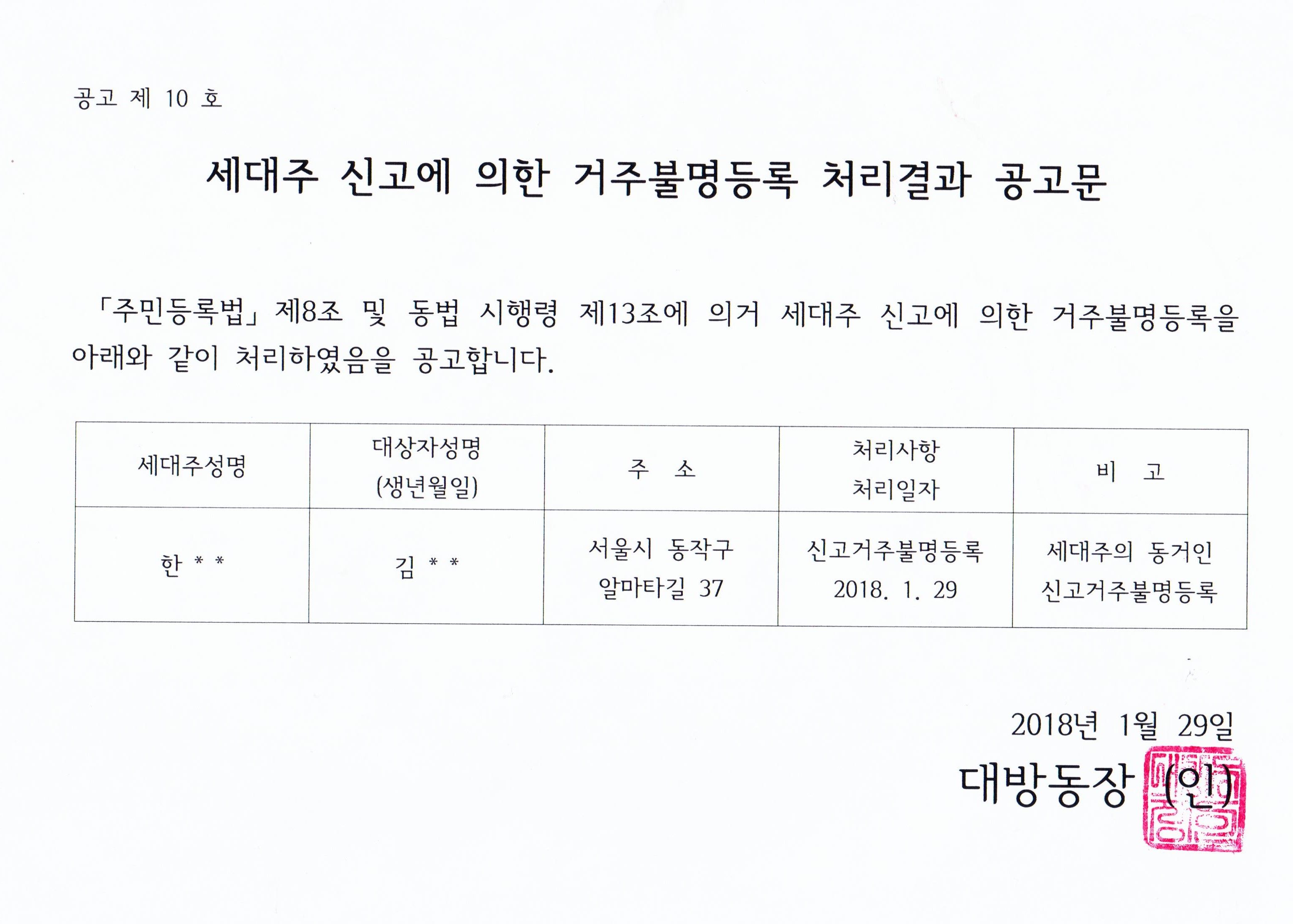 세대주가 거주불명등록 신고한 자에 대하여 처리결과를 붙임과 같이 공고합니다.1. 공고일자 : 2018. 1. 292. 공고기간 : 2018. 1. 29 ~ 2. 123. 공고대상 : 김 * *(78.06.07)4. 공고장소 : 동 주민센터 게시판 및 인터넷 홈페이지 게재