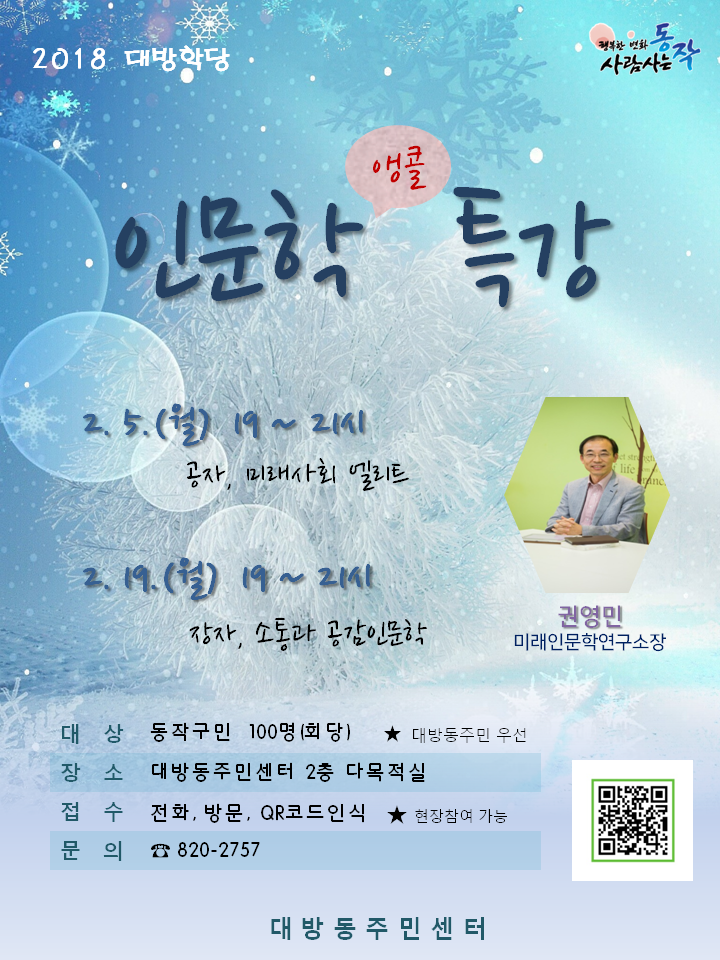 2018 대방학당에서는 작년도 인기강좌를 선정하여 인문학 앵콜특강을 진행합니다.