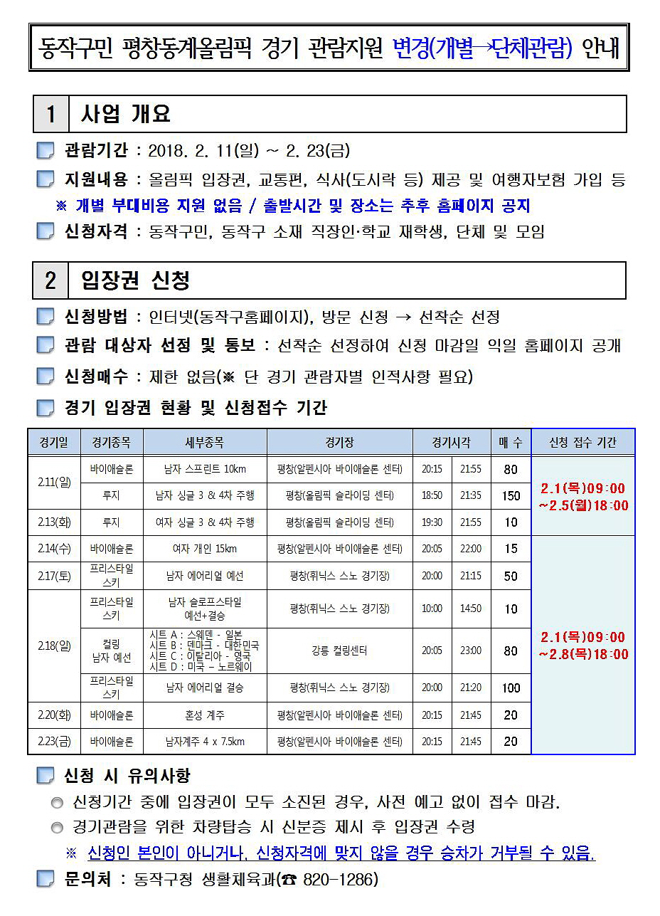 동작구민 평창동계올림픽 경기 관람지원 변경 안내(20180131수정)