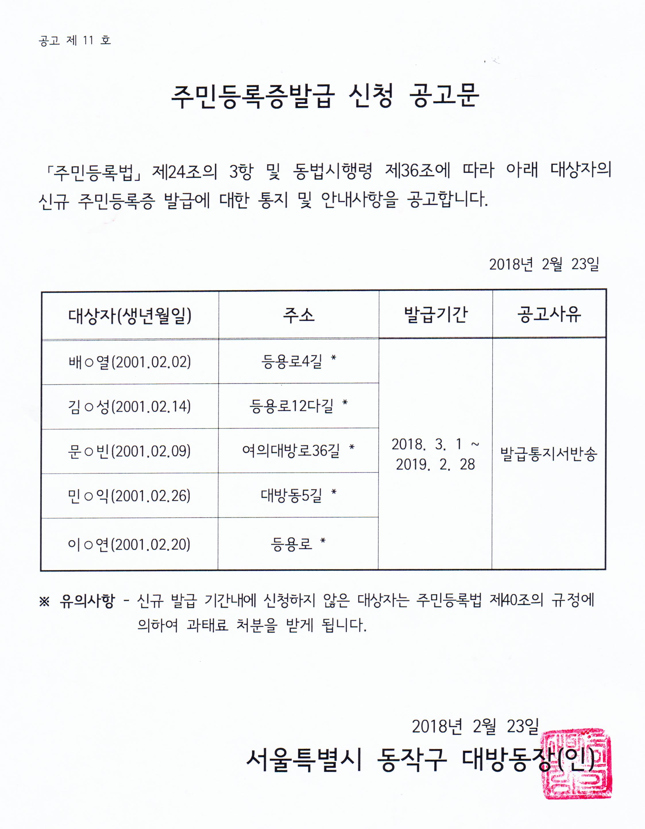 신규주민등록증 발급안내문 반송에 따른 공고(2001.2월생)