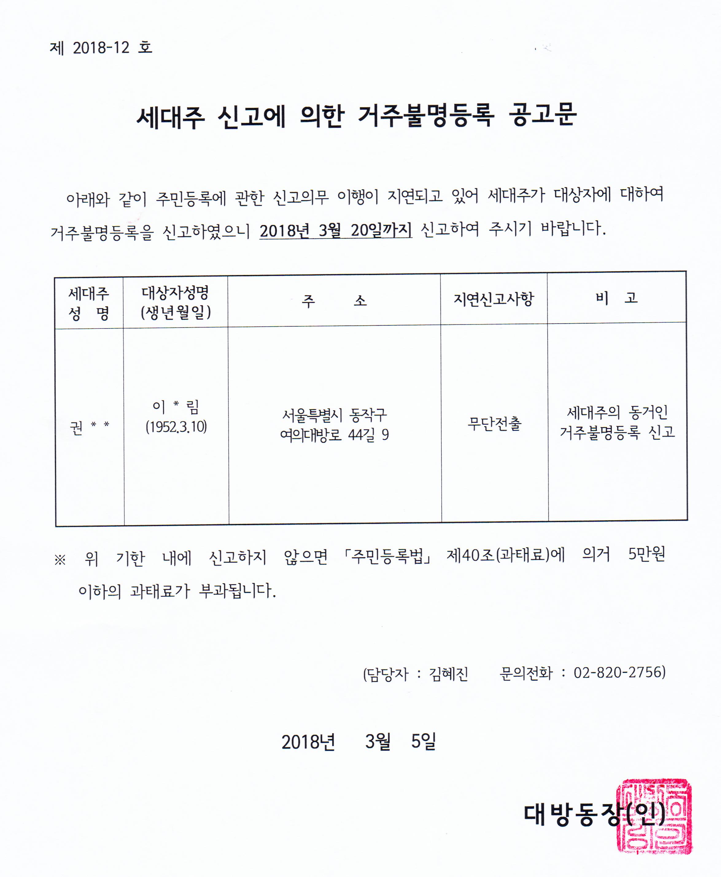 세대주가 거주불명등록 신고한 자에 대하여 처리결과를 붙임과 같이 공고합니다.1. 공고일자 : 2018. 3. 52. 공고기간 : 2018. 3 .5 ~ 3. 203. 공고대상 : 이 * *(52. 3. 10)4. 공고장소 : 동 주민센터 게시판 및 인터넷 홈페이지 게재
