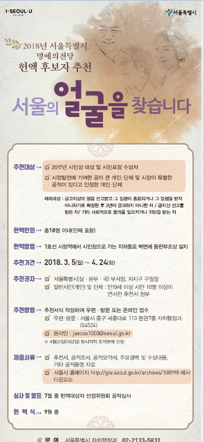 2018년 서울특별시 명예의 전당 헌액 후보자 추천!! < 서울의 얼굴을 찾습니다>