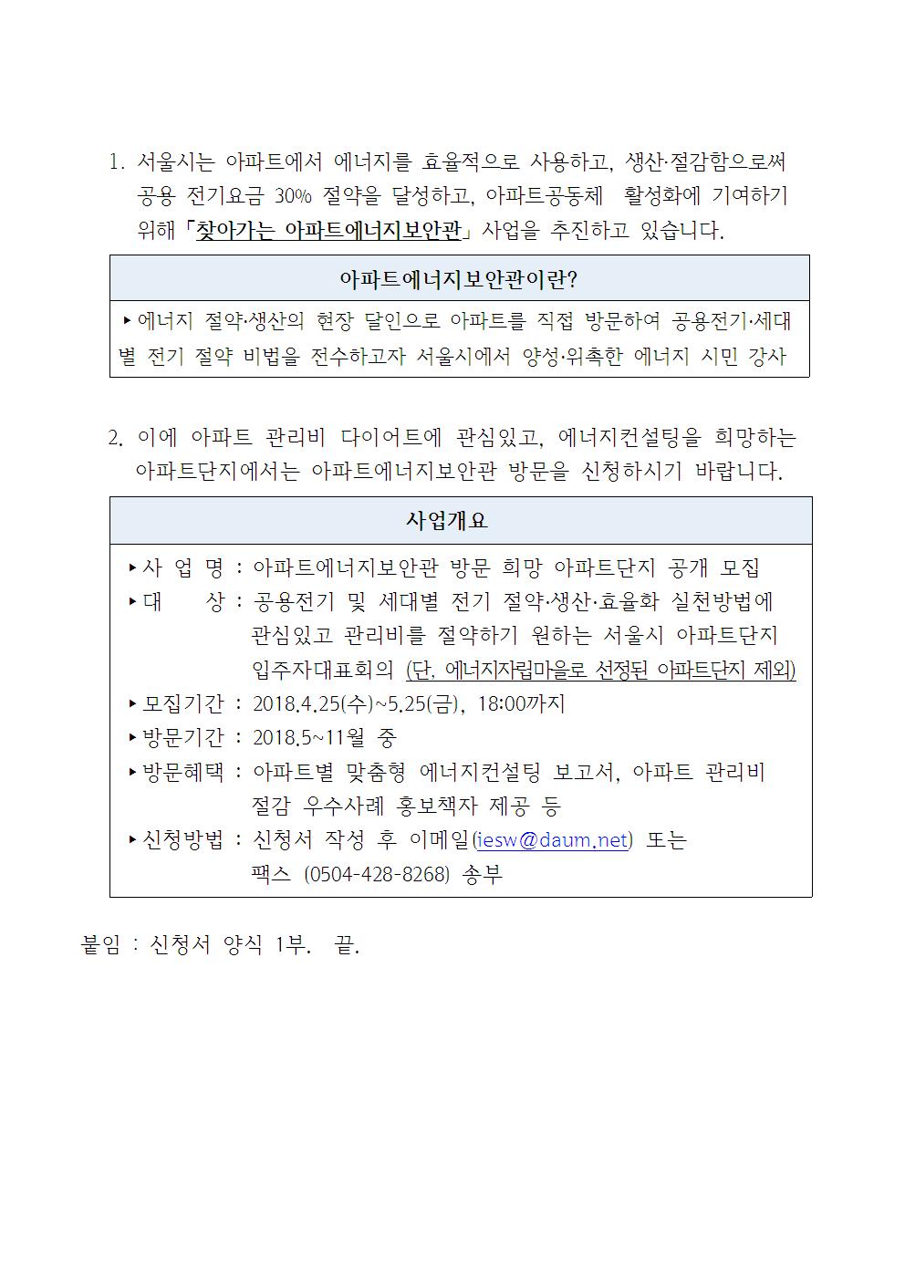 아파트에너지보안관 방문 희망 아파트 모집 공고 안내