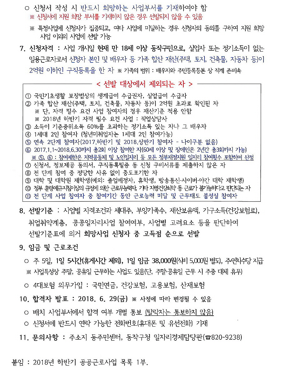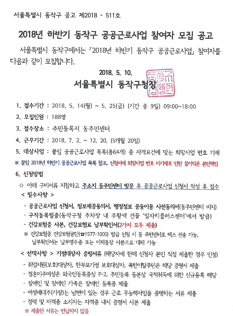 [동작구] 2018년 하반기 공공근로사업 참여자 모집 공고