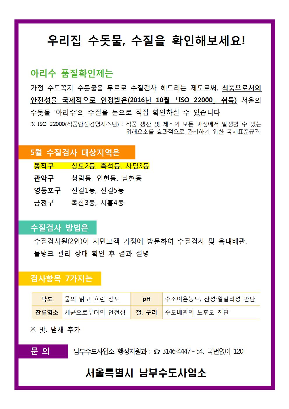 아리수 품질확인제 "우리집 수돗물, 수질을 확인해보세요!"
