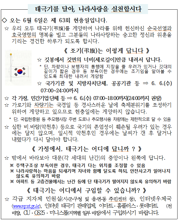 제63회 현충일 태극기를 달아, 나라사랑을 실천합시다.