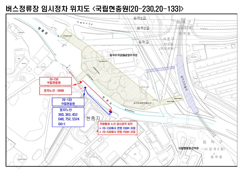 2. 임시이전 정류소(2개소) : 동작역, 국립현충원(20-133, 20-230)