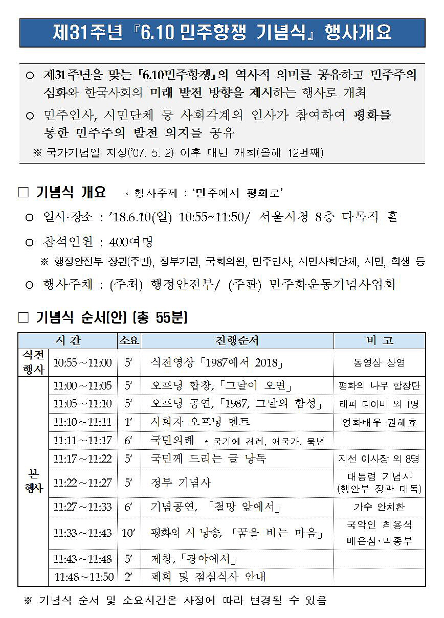 제31주년 「6.10 민주항쟁 기념식」 행사 안내
