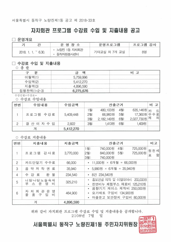 2018년 상반기 자치회관 프로그램 수강료 수입 및 지출내용 공고