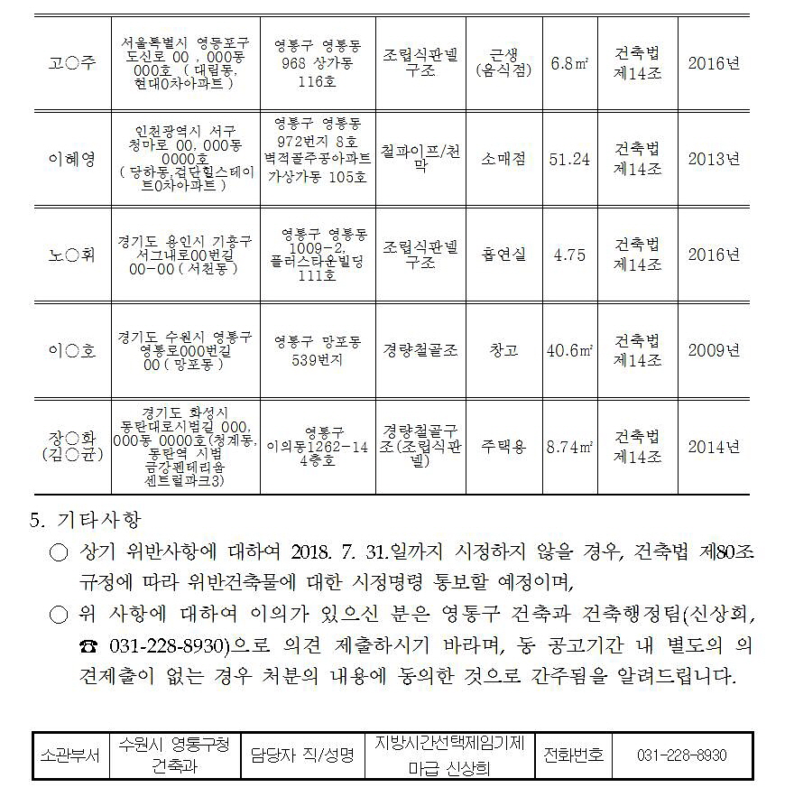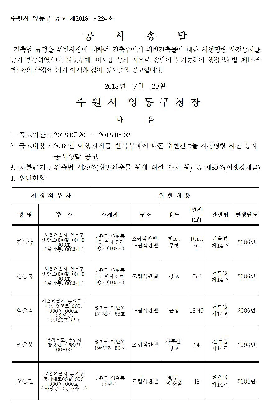 2018년 이행강제금 반복부과에 따른 위반건축물 시정명령 사전 통지 공시송달 공고