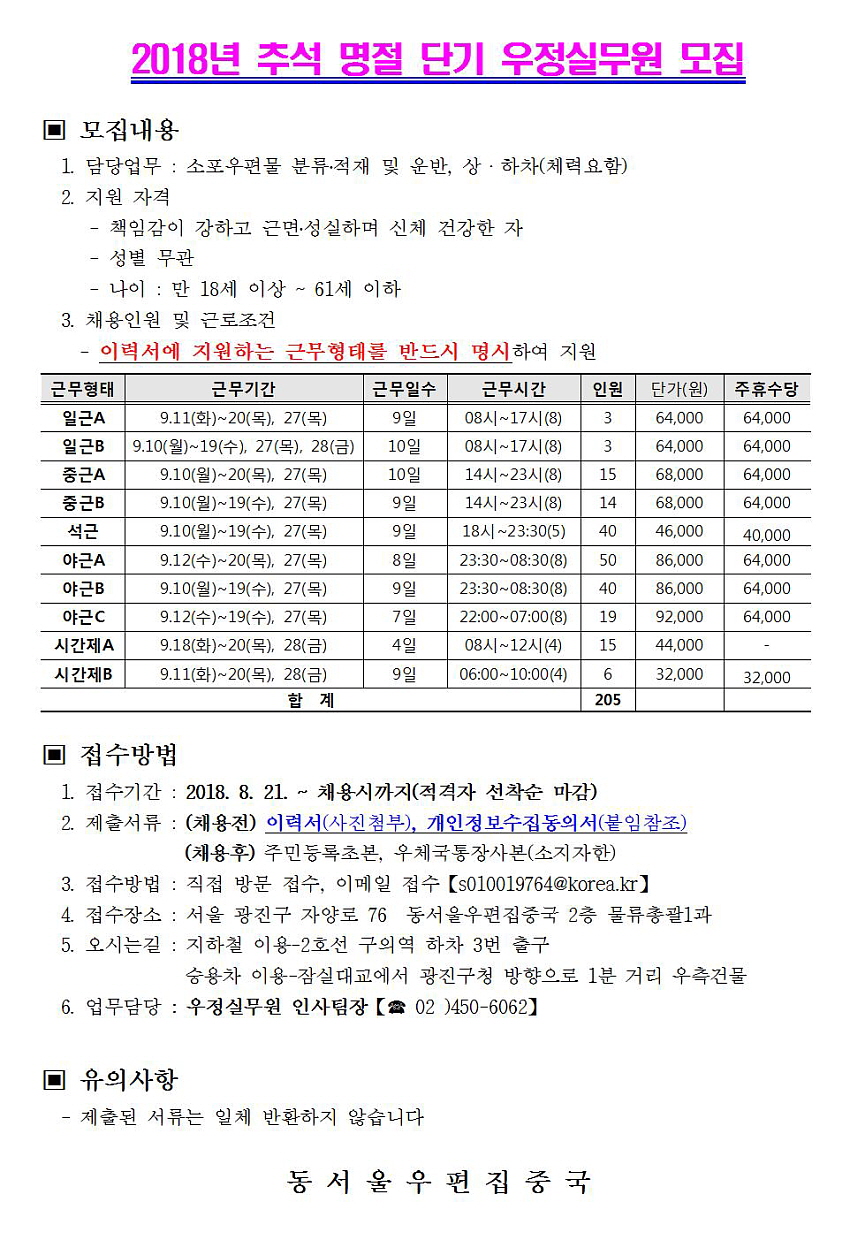 2018년 추석 명절 단기 우정실무원 모집