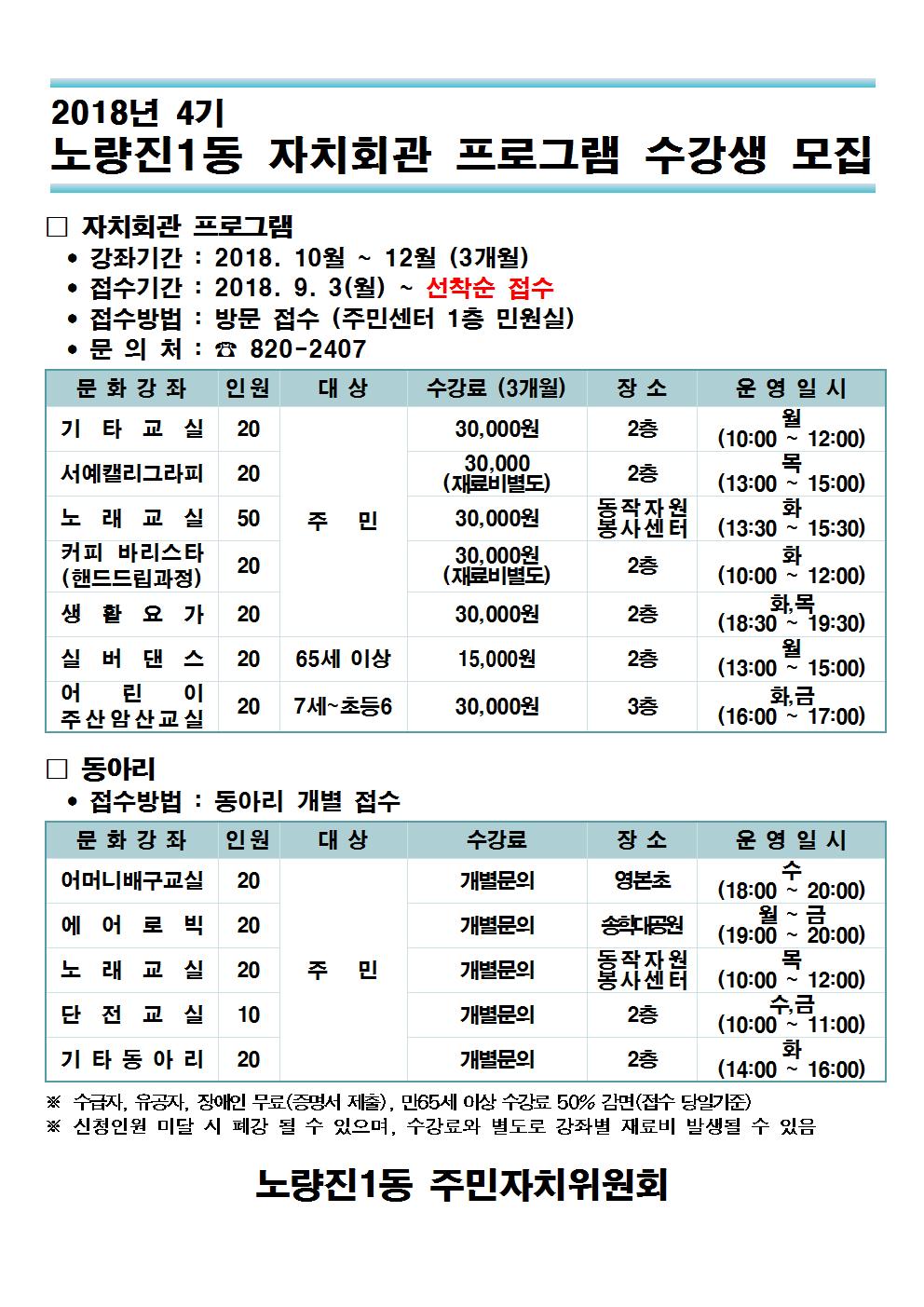 2018년 4기 노량진1동 자치회관 프로그램 수강생 모집 안내