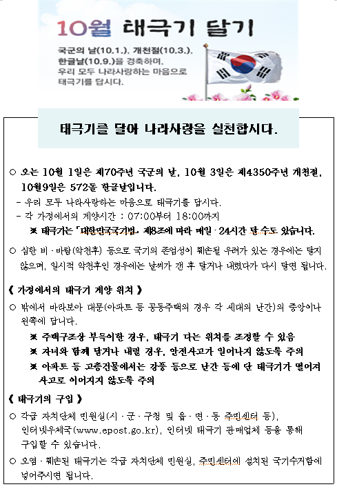 10월 우리 모두 나라사랑하는 마음으로 태극기를 답시다.