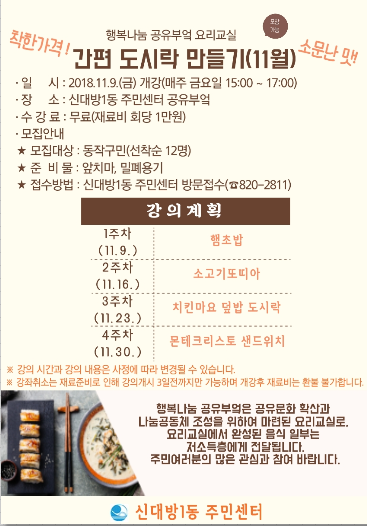 행복나눔 공유부엌 요리교실 수강생 모집(11월 과정)