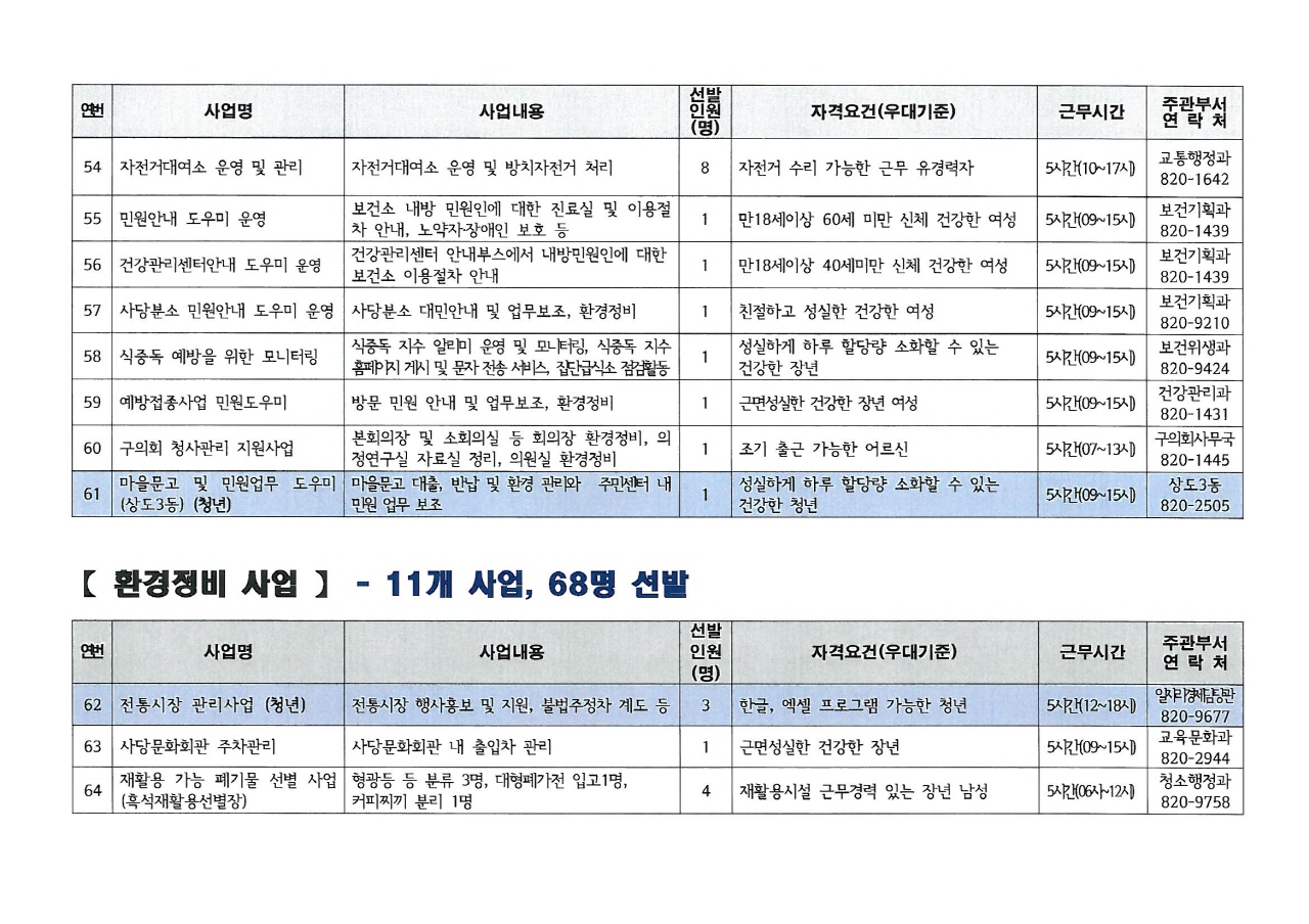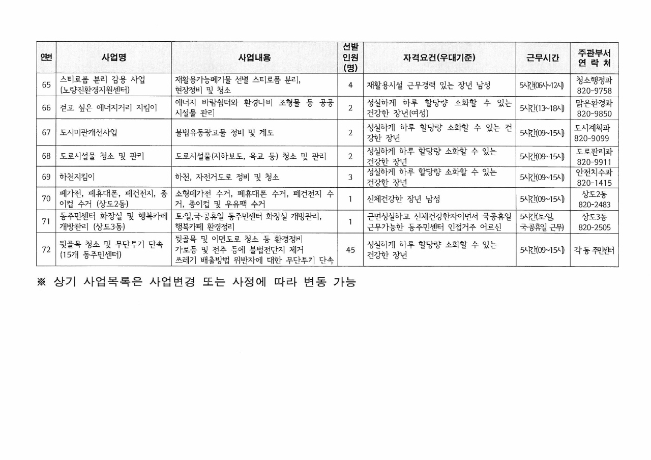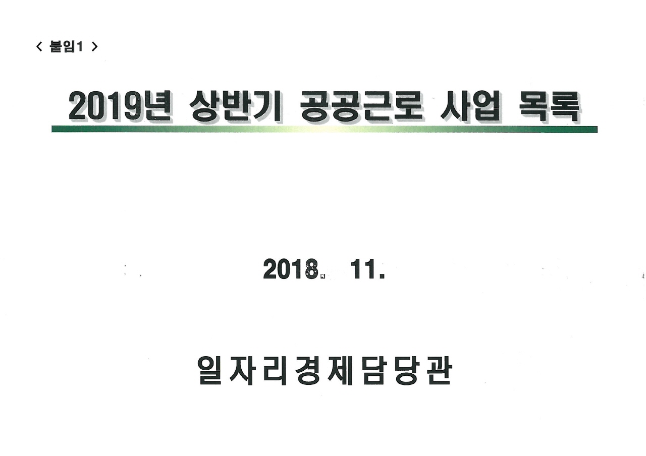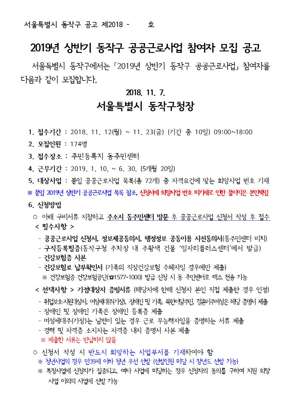 2019년 상반기 공공근로사업 참여자 모집 공고 및 사업 목록 안내(11.12.~11.23.)