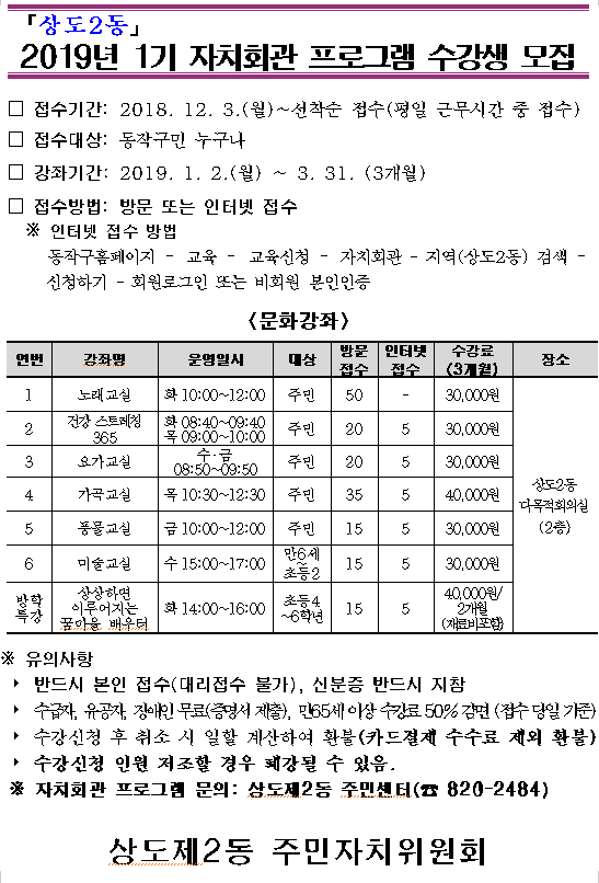 2019. 1기 상도2동 자치회관 프로그램 수강생 모집