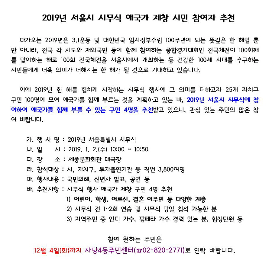 2019년 서울시 시무식 애국가 제창 시민 참여자 추천