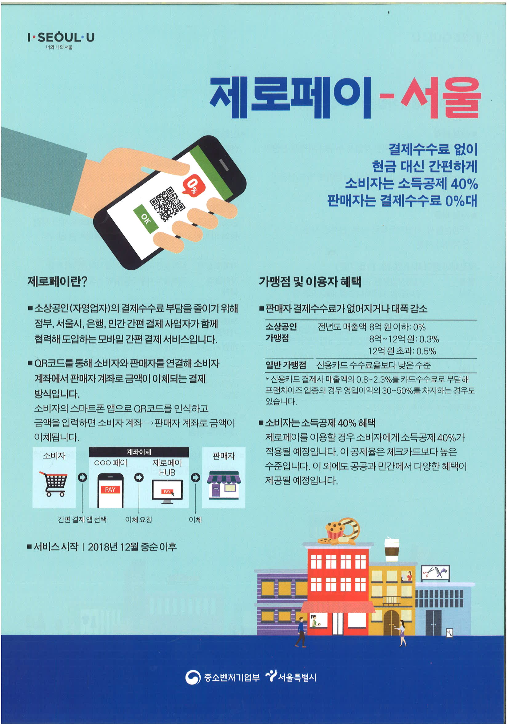 소비자의 스마트폰 앱으로 QR코드를 인식하고 금액을 인식하면 소비자 계좌에서 판매자 계좌로 돈이 이체되는 직거래 시스템으로 이체 수수료 감면을 통한 소상공인 결제 수수료 부담 완화, 소비자는 소득공제 40% 혜택 |