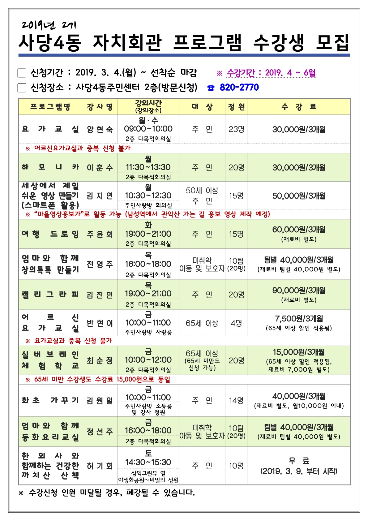 2019년 2기 사당4동 자치회관 프로그램 수강생 모집(2019. 3. 4. 월 09:00부터 접수)