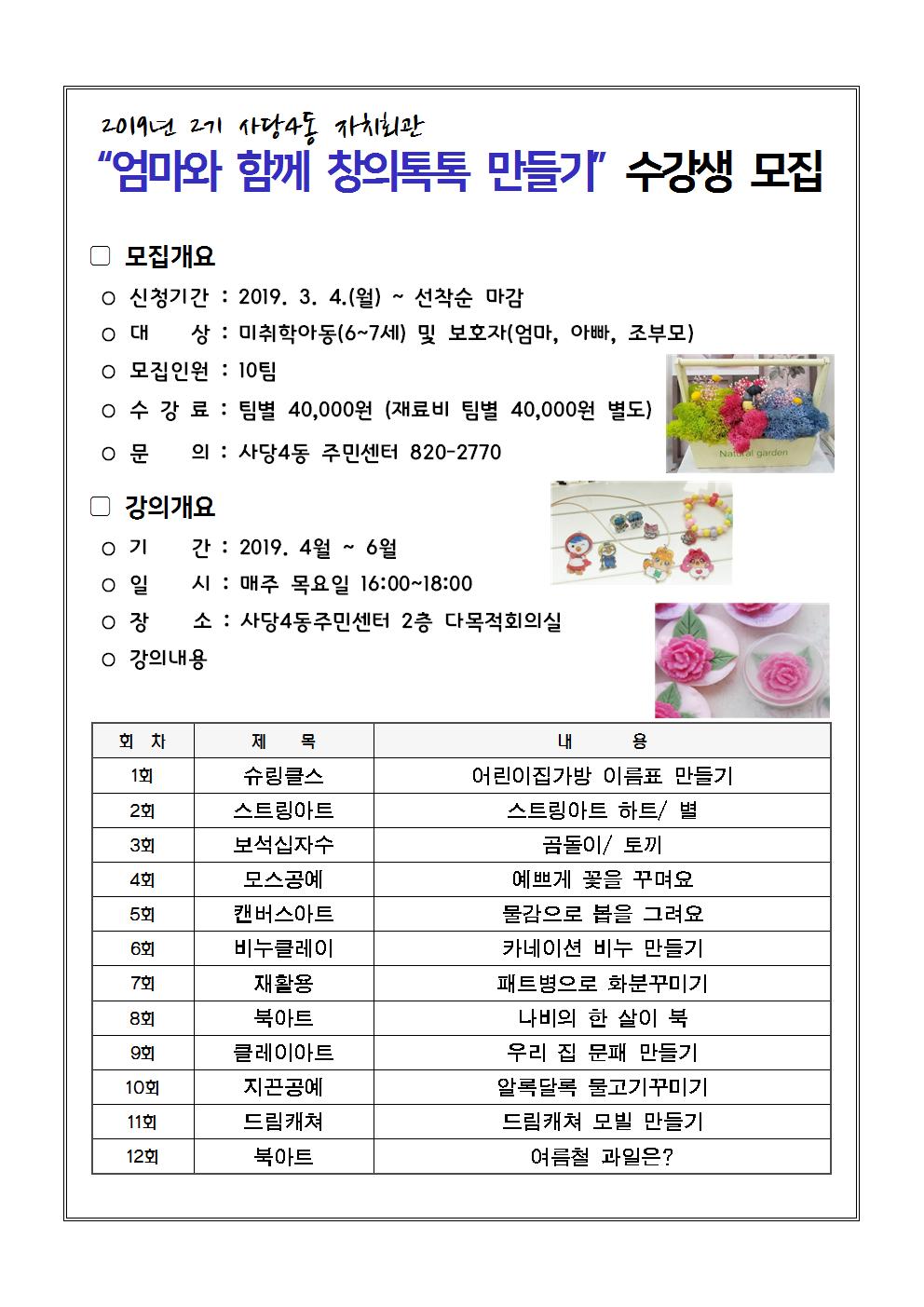 엄마와 함께 창의톡톡 만들기 수강생 모집 - 2019년 2기 사당4동 자치회관 프로그램 -