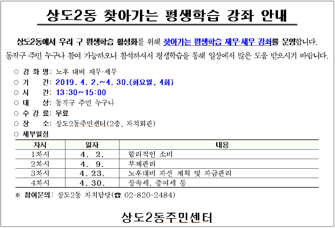 상도2동 찾아가는 평생학습 재무·세무 강좌에 주민분들의 많은 참여 부탁드립니다.