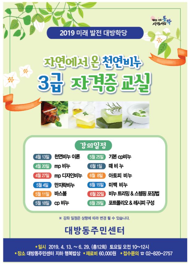 2019 미래발전 대방학당, 자연에서 온 천연비누 3급 자격증 교실 모집
