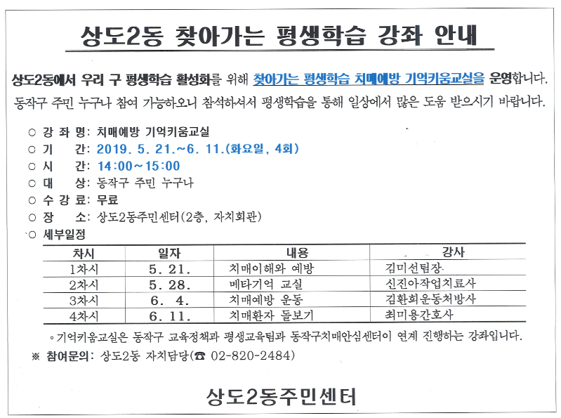 상도2동 찾아가는 평생학습 「기억키움교실(치매예방)」 강좌 수강생 모집 안내
