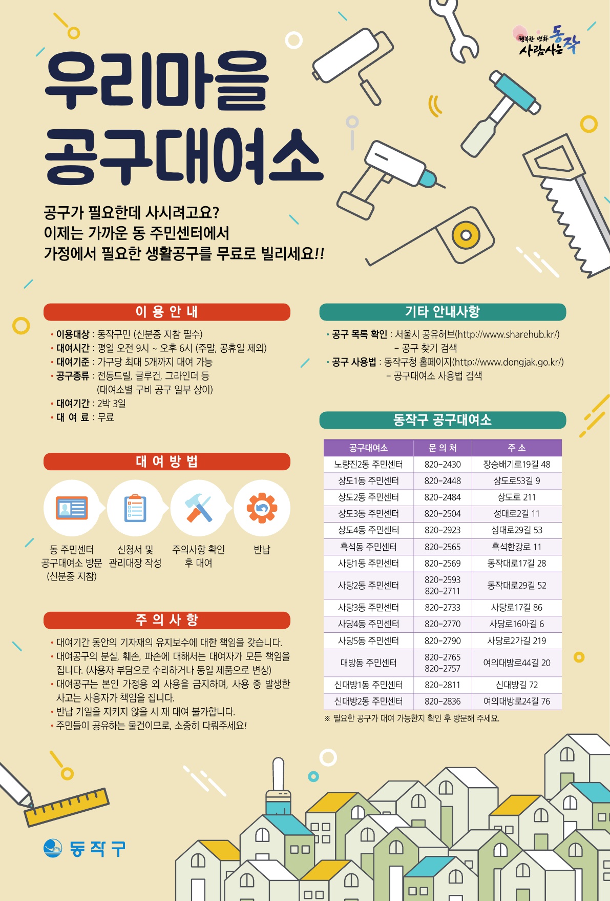 - 사당4동 대여 공구 : 전동드릴세트, 다목적공구함, 만능렌치, 전선릴, 대패, 수평계, 손타카, 충전드릴 등 25종