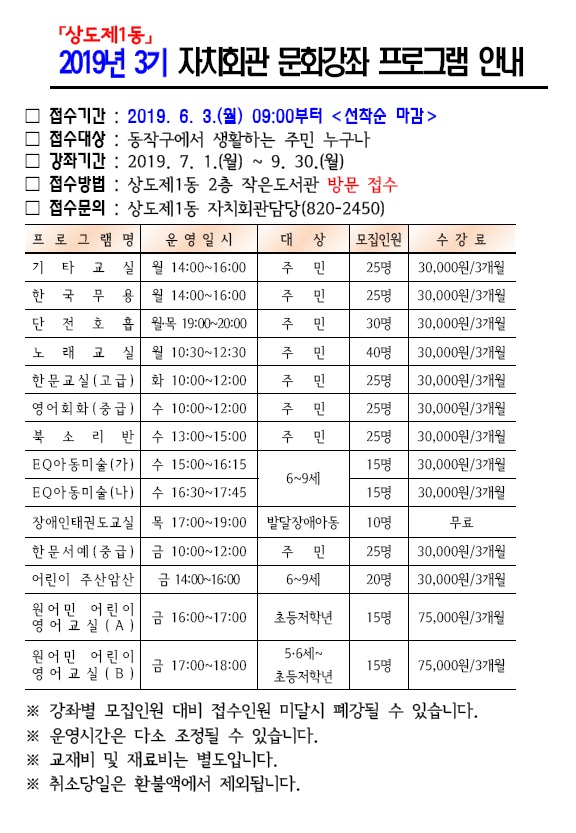 2019.3기 자치회관 문화강좌 프로그램 접수 안내