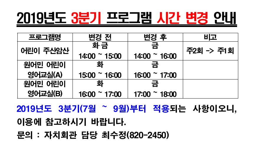 * 2019. 3기부터 일부 프로그램 운영 시간이 조정되었으니 이용에 참고하시기 바랍니다.