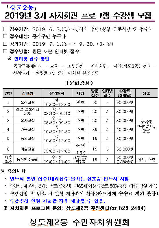 2019. 3기 상도2동 자치회관 프로그램 수강생 모집 안내(접수 2019. 6. 3.(월)~선착순 마감)