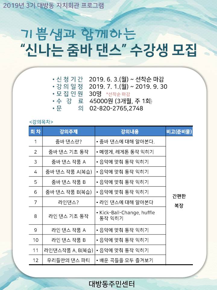 2019년 3분기(7월~9월) 대방동 자치회관 프로그램 줌바댄스 개설 알림