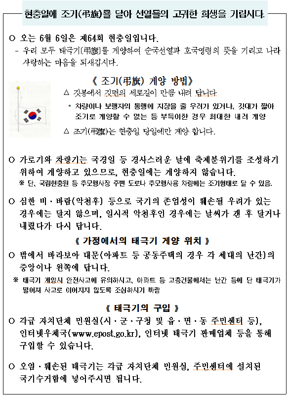 제64회 현충일 태극기 조기[弔旗]를 달아 선열들의 고귀한 희생을 기립시다.