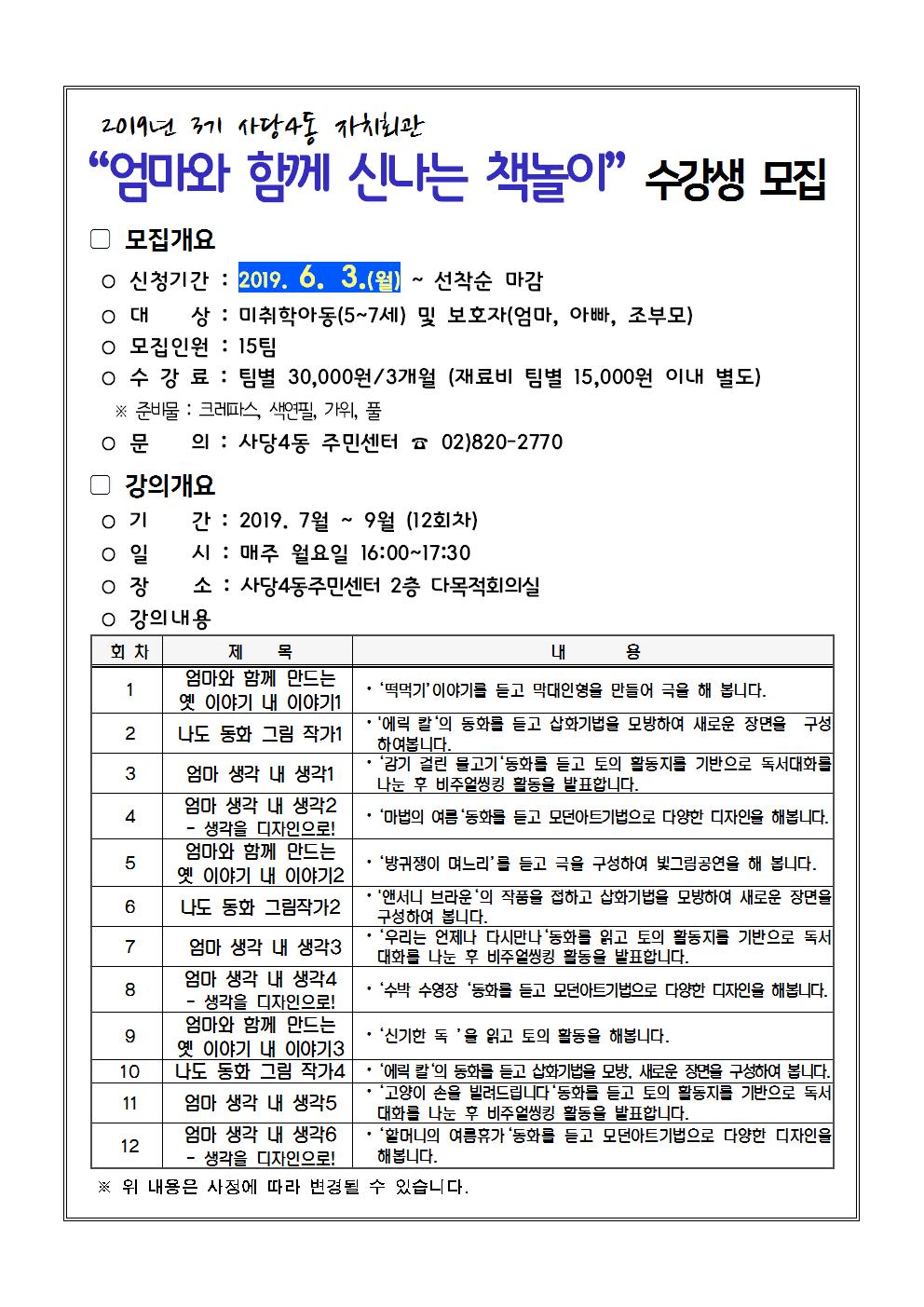 [사당4동 자치회관 프로그램] 엄마와 아이가 함께하는 프로그램 수강생 모집 안내 (동화요리교실, 신나는책놀이)