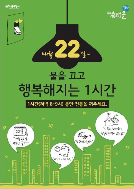 저녁 1시간(20~21시) 전등을 소등하는 행복한 불끄기의 날 캠페인을 추진하고 있습니다.^^