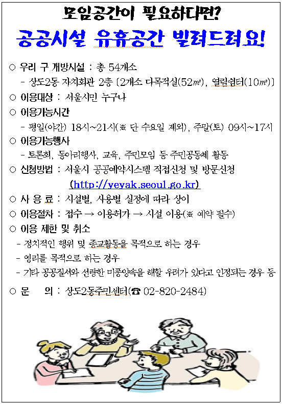 " 각종 모임이나 회의 공간이 필요하다면 공공시설 유휴공간을 이용하세요"