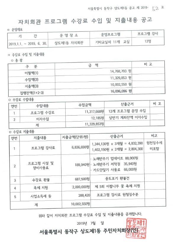 2019년 상반기 자치회관 프로그램 수강료 수입 및 지출내역을 아래와 같이 공고합니다.