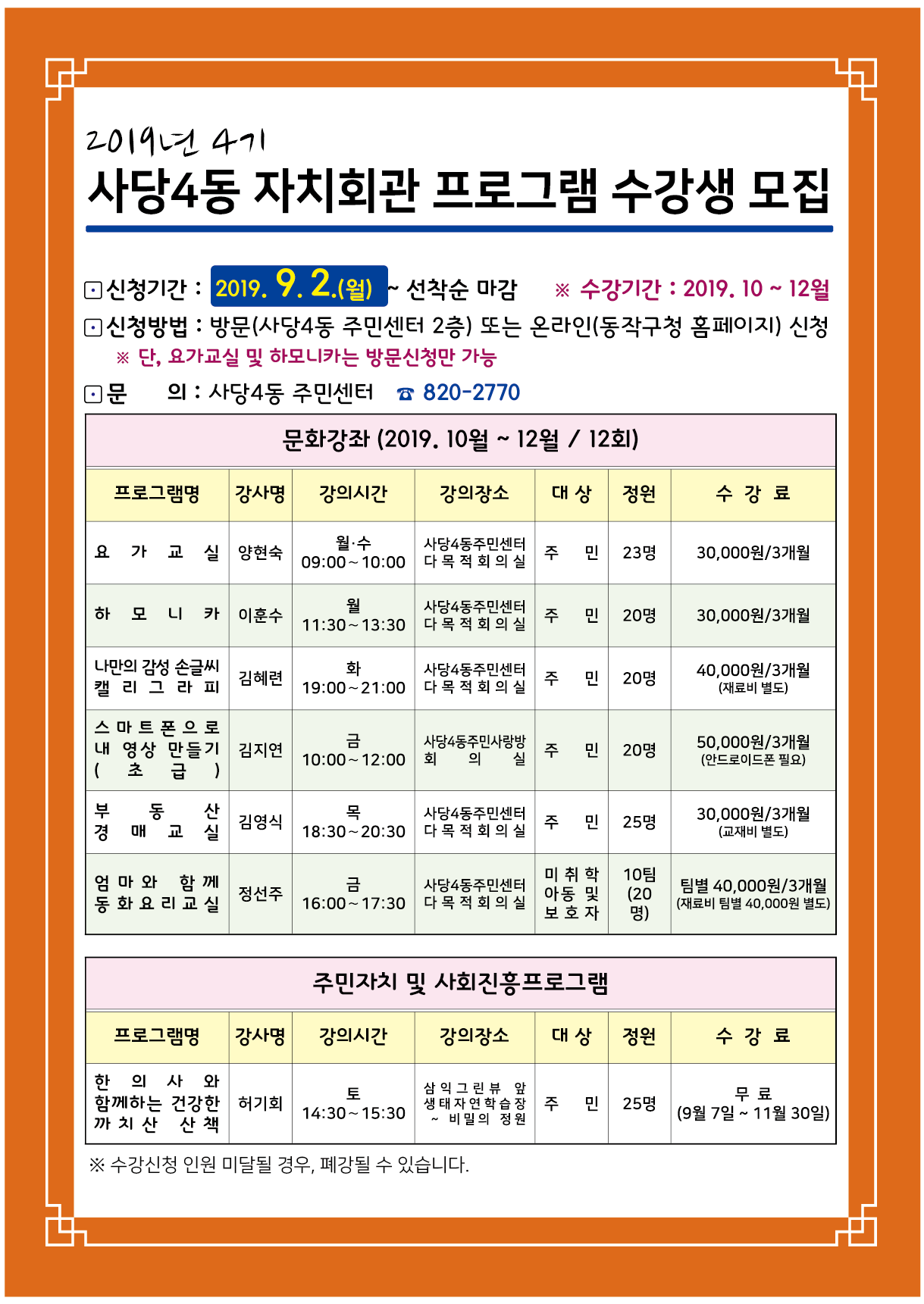2019년 4기 사당4동 자치회관 프로그램 수강생 모집 [2019. 9. 2.(월) 09:00 ~ 선착순 마감]