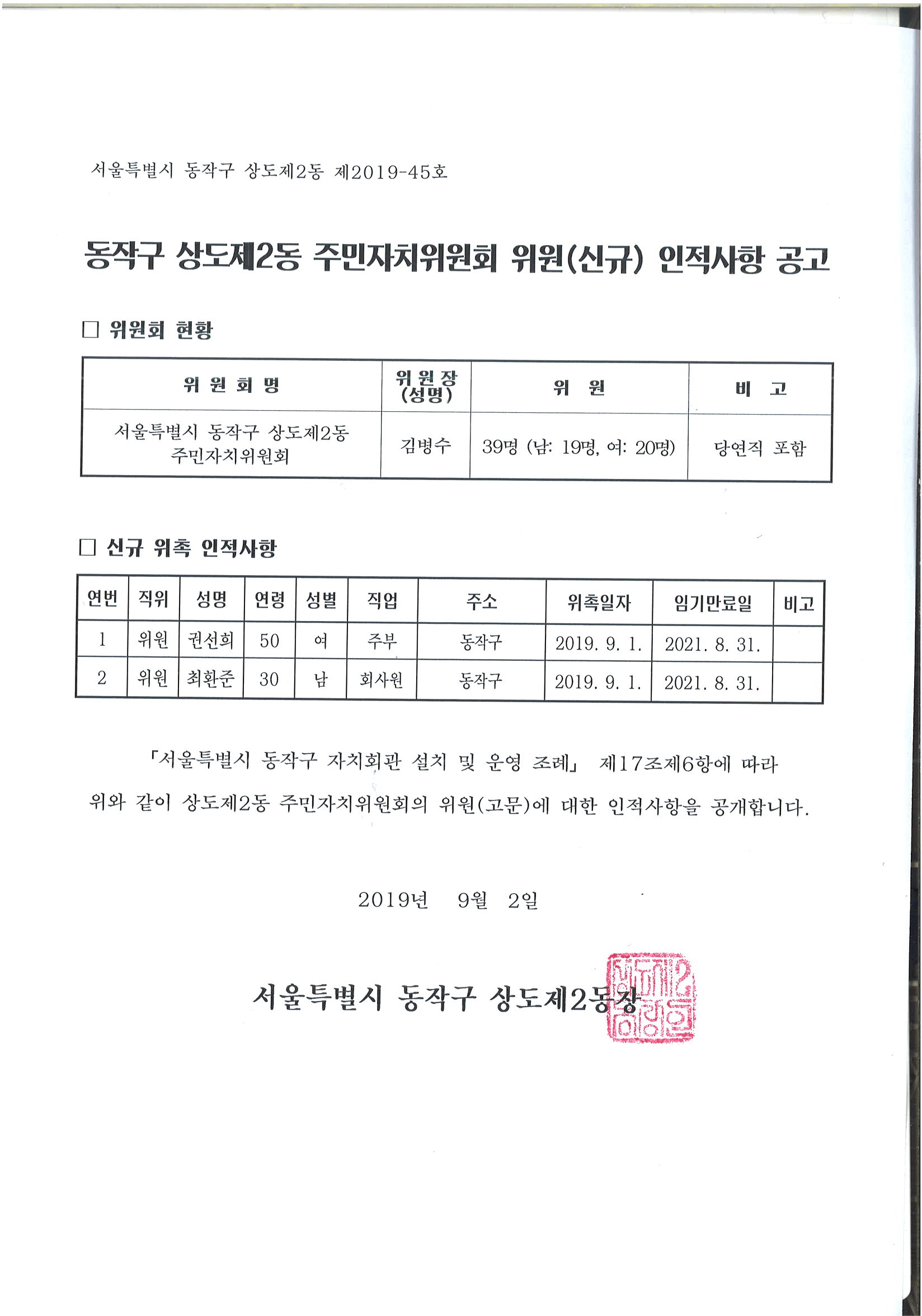 동작구 상도제2동 주민자치위원회 위원(신규) 인적사항 공고