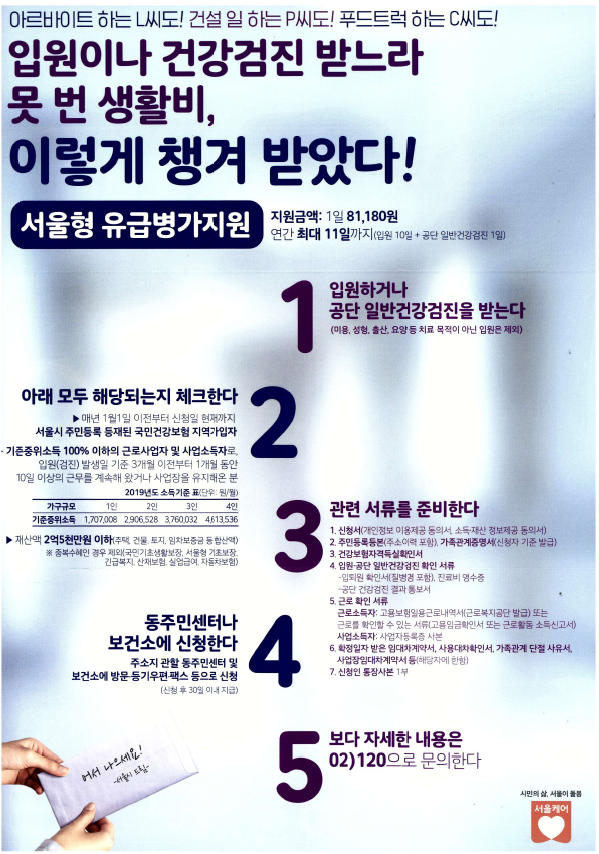 ○ 지 원 금 액: 1일 81,180원(’19년 서울특별시 생활임금) ○ 지 원 기 간: 연간 최대 11일(입원 10일, 공단 일반건강검진 1일) ○ 전 달 체 계: 접수(동주민센터, 보건소)‣심사(보건소)‣결정(보건소)‣지급(보건소) <직종예> - 일용직근로자 - 1인 자영업자 - 보험방문 판매인 - 아르바이트 - 택배원 - 퀵서비스 배달 - 임시근로자 - 대리기사 - 학습지 교사 |