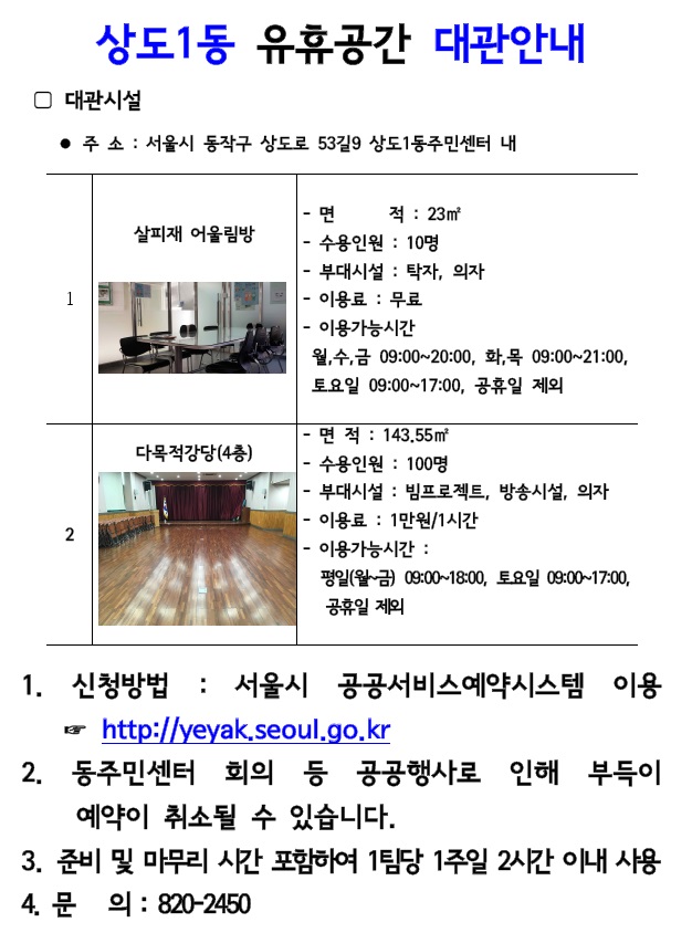 상도1동 주민센터 자치회관 유휴공간 대관안내