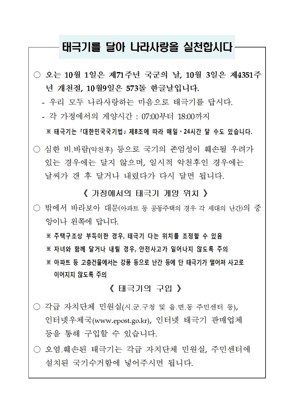 10월 나라사랑 태극기 달기 운동 참여 협조