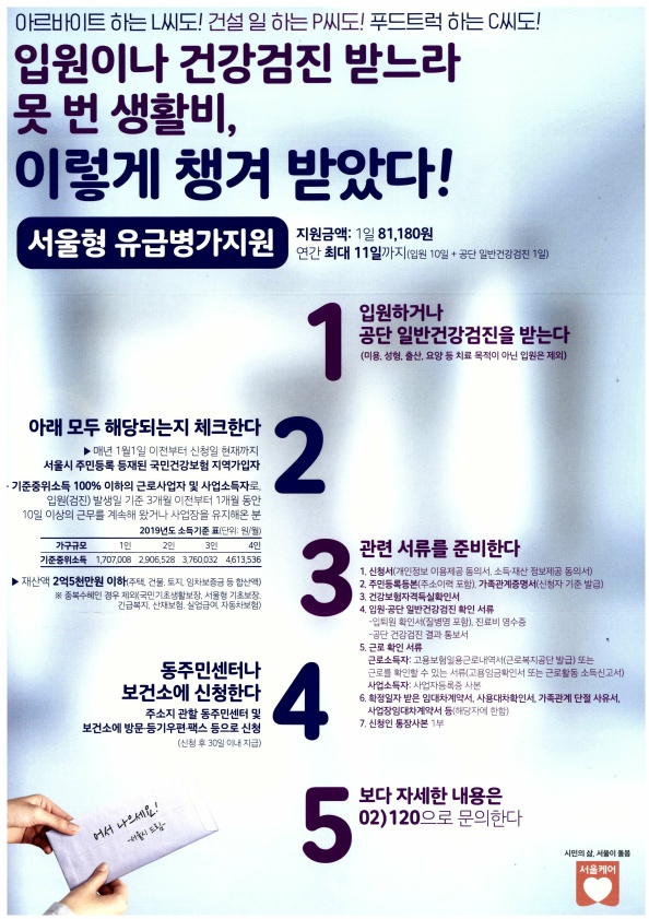 ○ 내 용 : 입원이나 공단 건강검진을 받은 근로취약계층에게 생활비 지급