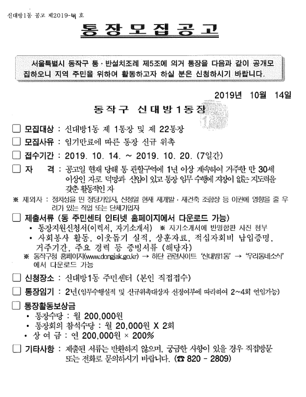 제1통 및 제22통 통장 공개모집 공고